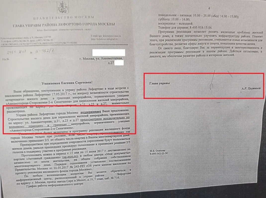 В частности, мне показали официальный письменный ответ за подписью главы управы Лефортово А.Р. Царикаева, где написано, что “строительство жилого дома для переселения жителей микрорайона, проживающих по адресу: ул. Авиамоторная, д.21, д.23 и д.27 предусмотрено исключительно в границах микрорайона, ограниченного улицами “Авиамоторная - Сторожевая - 2-я Синичкина”.